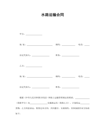 甲方: 地 址: 郵碼: 電話: 法定代表人: 職務: 乙方: 地 址: 郵碼: 電話: 法定代表人: 職務: 根據(jù)《中華人民共和國合同法》和海上運輸管理規(guī)定的要求, (簡稱甲方)向 交通海運局(簡稱乙方),計劃托運 貨物,乙方同意承運,特簽定本合同,共同遵守,互相制約,具體條款經(jīng)雙方協(xié)商如下:一、運輸方法:乙方調(diào)派 噸位船舶一艘(船舶 吊裝設備),應甲方要求由 港運至 港,按現(xiàn)行包船運輸規(guī)定辦理。二、貨物集中:甲方應按乙方指定時間,將 貨物于 天內(nèi)集中于 港,貨物集齊后,乙方應在5天內(nèi)派船裝運。三、裝船時間:甲方聯(lián)系到達港同意安排卸裝后,經(jīng)乙方落實并準備接收集貨(開集日期由乙方指定)。裝船作業(yè)時間,自船舶抵港已靠好碼頭時起于 小時內(nèi)裝完貨物。
